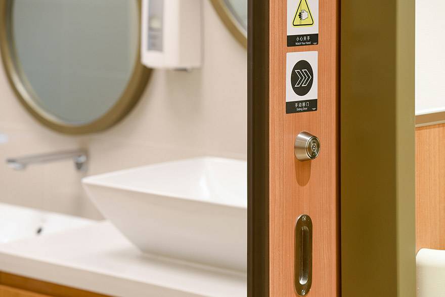 无障碍区域,采用国际先进的滚珠轨道移门系统,高精度的滚珠和精细的凹槽,进行很好的配合,开启轻松顺滑,自动关闭,末端缓冲;它无声的运行着,默默地守护者穿梭于门扇的人群,为医患人员带来无限出入便利。